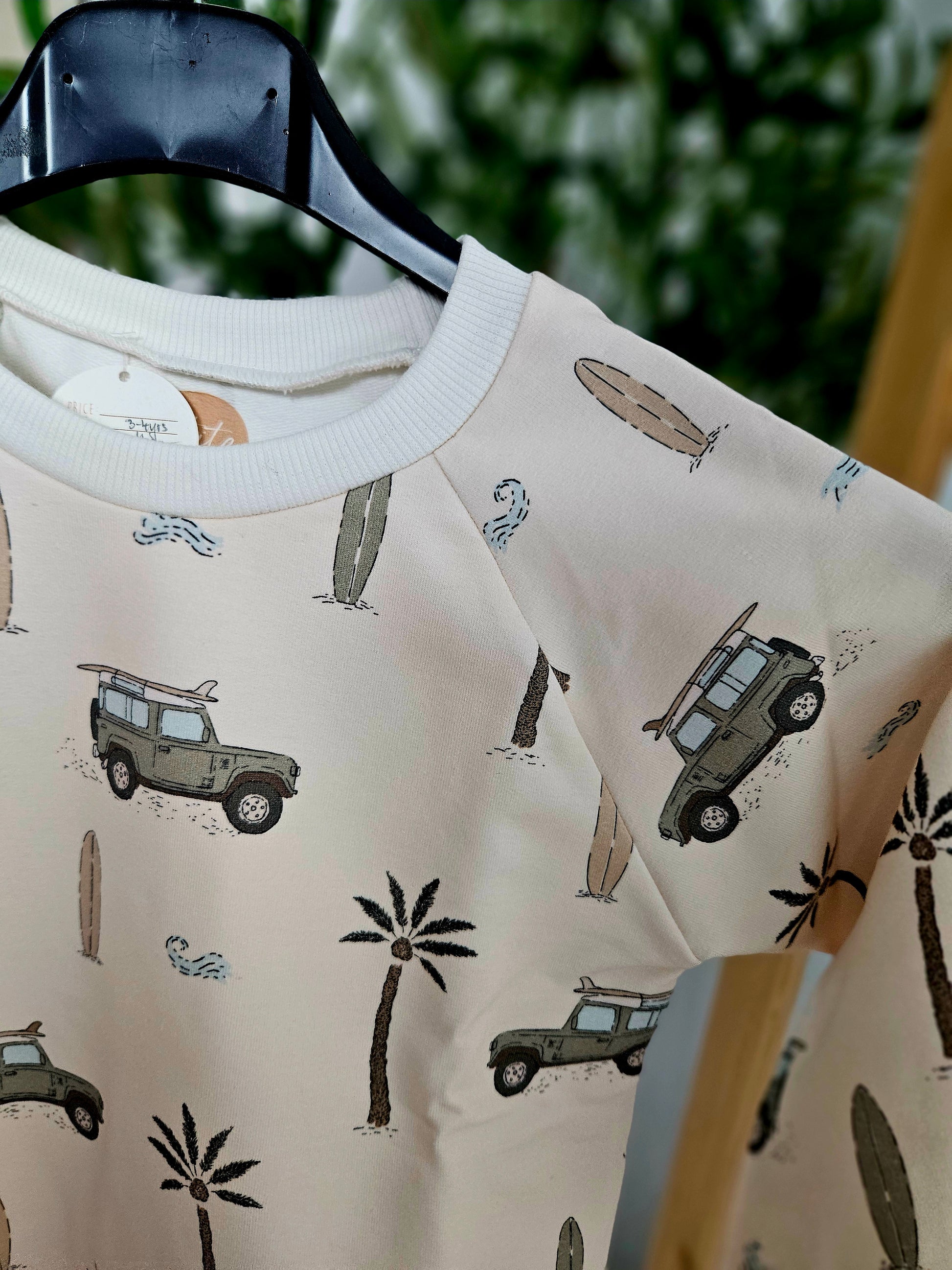 - Auffälliger Retro-Print mit Motiven wie Palmen und Autos