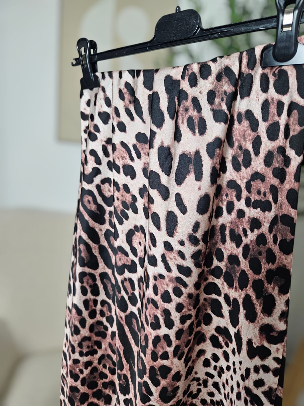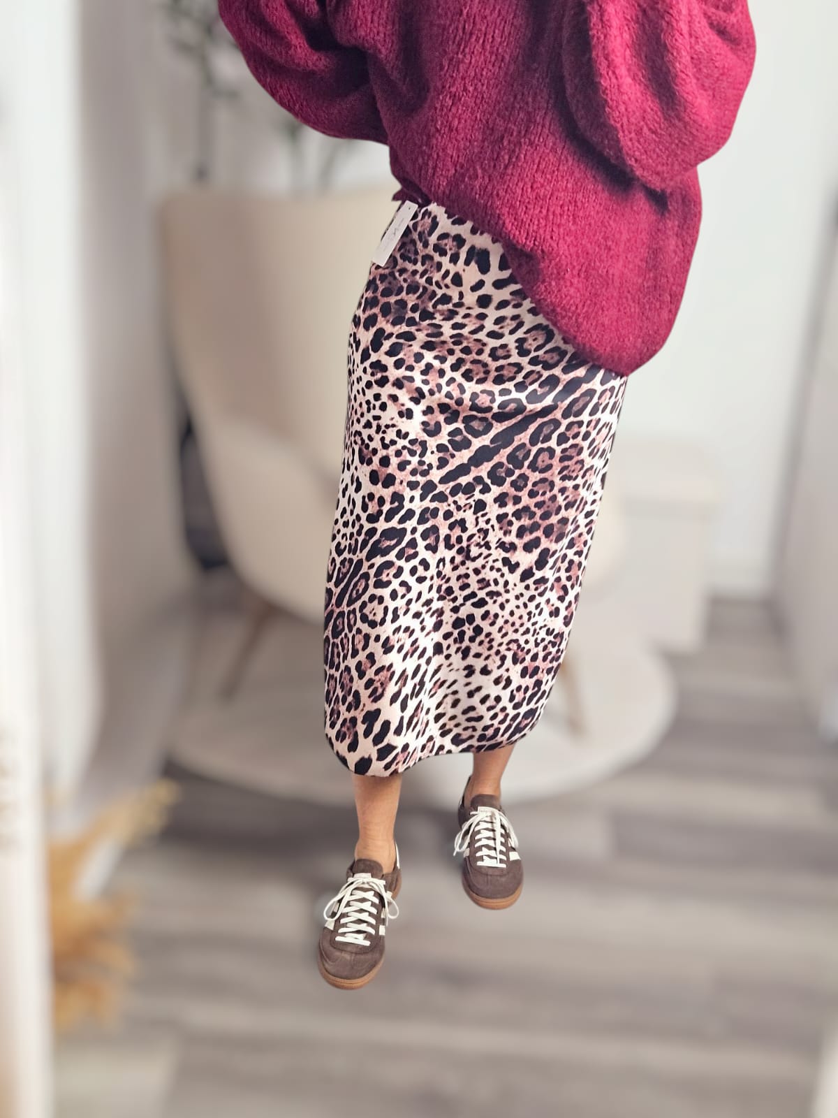 Dieser modische Midirock mit auffälligem Leopardenmuster ist ein echtes Highlight für jede Garderobe. Der fließende Stoff sorgt für einen angenehmen Tragekomfort und verleiht dem Outfit eine elegante Note. Mit einem elastischen Bund sitzt der Rock perfekt und lässt sich vielseitig kombinieren – ob mit einem lässigen Sweater oder einer schicken Bluse. Ideal für den Alltag oder besondere Anlässe, dieser Rock bringt einen Hauch von Abenteuer in deinen Look!