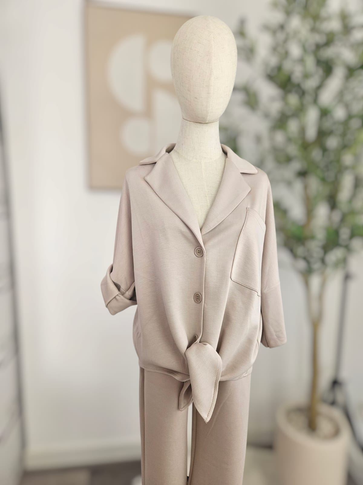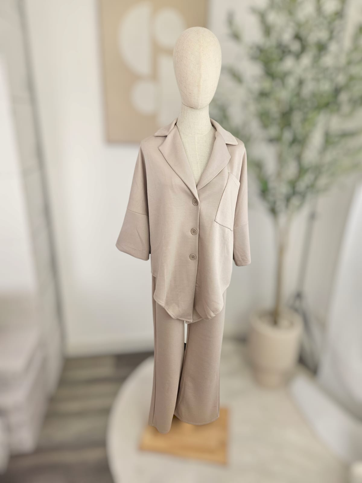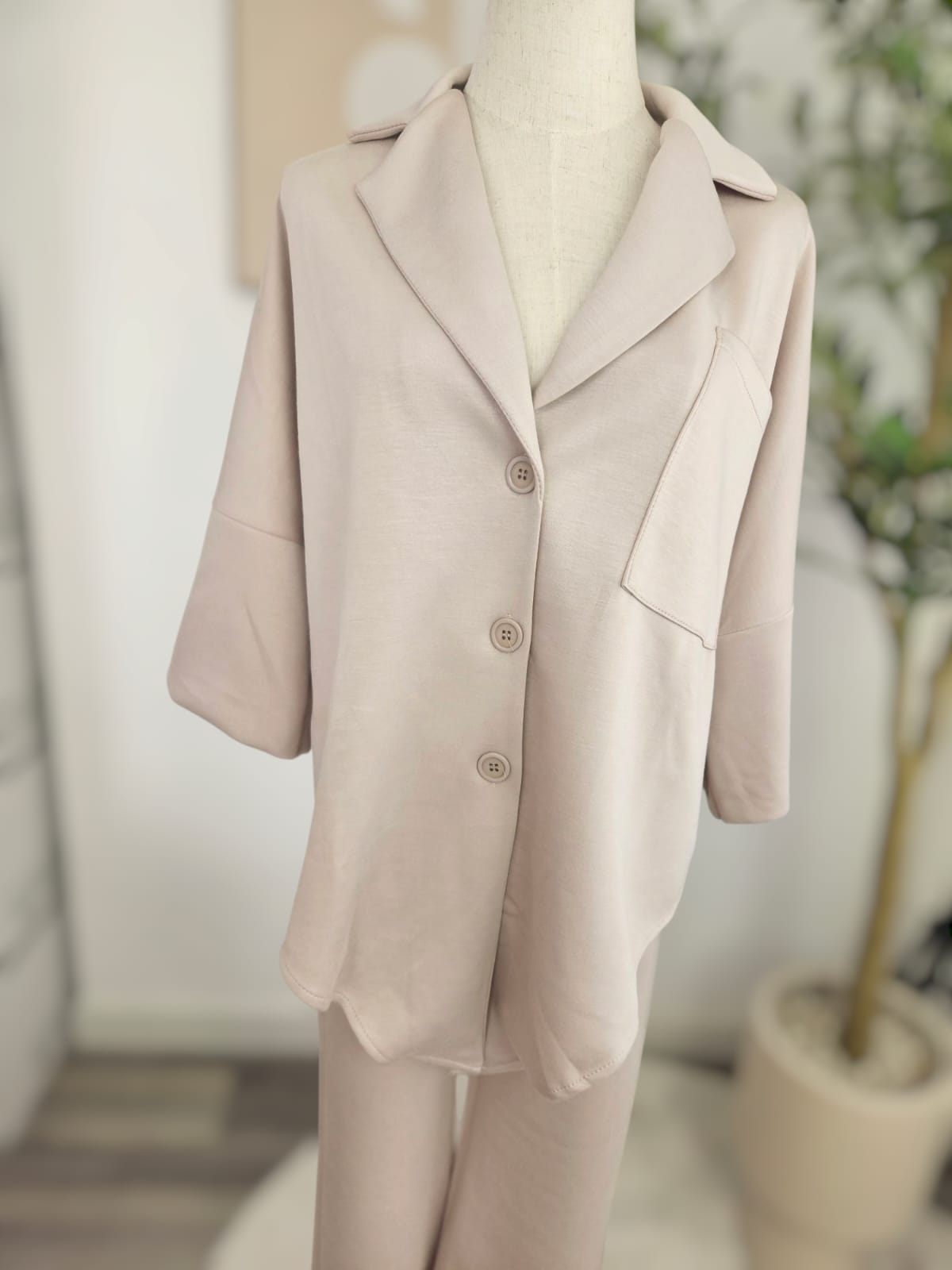 Erlebe Komfort und Stil mit unserem eleganten Zweiteiler aus hochwertiger Viskose! Das Set besteht aus einem lässigen, übergroßen Oberteil mit einem klassischen Reverskragen und praktischen Knöpfen, sowie einer passenden Hose, die für eine schmeichelhafte Silhouette sorgt. Die weiche Viskose sorgt für ein angenehmes Tragegefühl und einen leichten Fall.